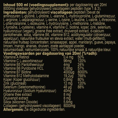 Eén shotje per dag levert je maar liefst 12 micronutriënten en 8000 mg collageen peptiden uit gehydrolyseerd viscollageen op. Deze mix van antioxidanten, vitamines en mineralen laten je van binnen én buiten stralen. Vandaar dat alle ingrediënten leveren een bijdrage aan een gezonde en stevige huid: