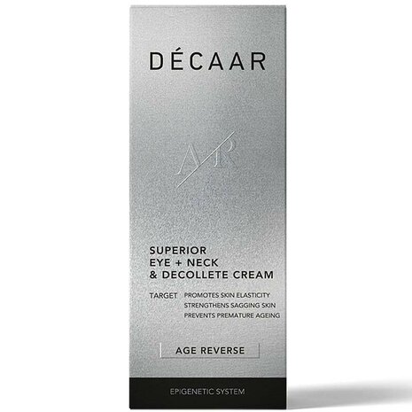 Decaar Superior Eye, Neck & Decollete Cream uit de Age Reverse Line is een luxe en doelgerichte verzorgende crème die speciaal is ontwikkeld voor de delicate zones rondom de ogen, hals en decolleté. Met geavanceerde epigenetische technologie en een krachtige mix van actieve ingrediënten biedt deze lichtgewicht crème een effectieve oplossing voor het verminderen van zichtbare tekenen van veroudering, zoals rimpels, verslapping en ruwheid.